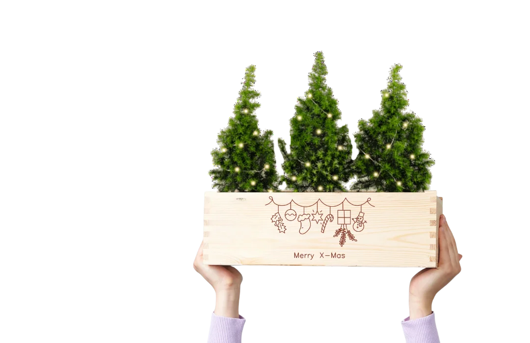 Das Xmas out of the Box besteht aus 3 Weihnachtsbäumen und diversen Zusatzoptionen, wie Beleuchtung, Weihnachtsdekoration und kulinarische Köstlichkeiten. Wir bieten diese BloomsBox in der Large und Extra Large Version an. Alle BloomsBoxen für Weihnachten enthalten Weihnachtsbeleuchtung und/oder Weihnachtsschmuck aus Holz. Der Beschenkte dieses nachhaltigen Weihnachtsgeschenks füllt die BloomsBox mit Wasser, hängt die Weihnachtsbäume in den Deckel und kann die Bäume dann selbst mit den mitgelieferten Lichtern und Dekorationen schmücken. Welche BloomsBox Sie auch wählen; Mit diesem originellen Weihnachtsgeschenk kommen Ihre Verwandten und Kollegen garantiert sofort in Weihnachtsstimmung!